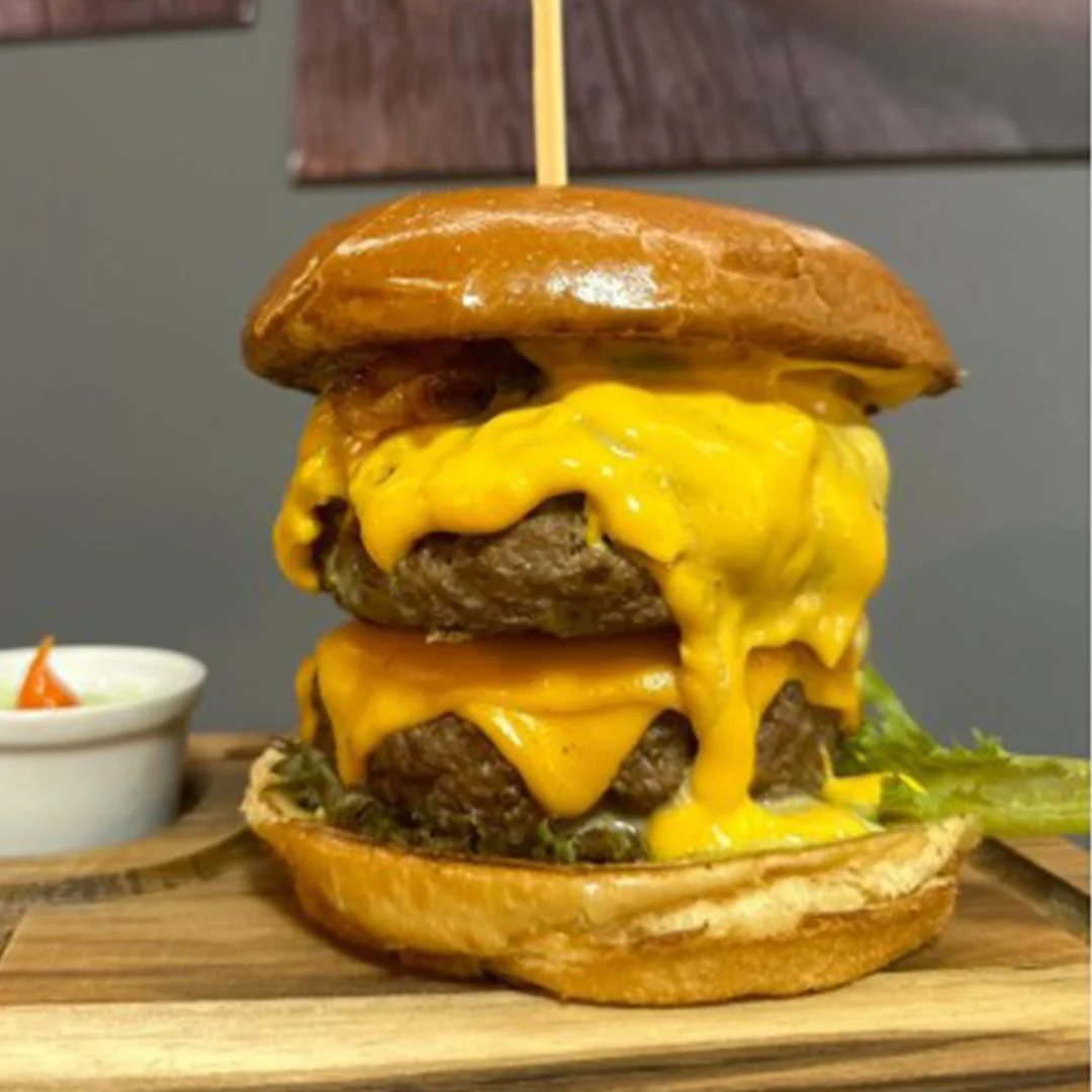 Pão especial, 2 blendes de 150gr, 2 queijos cheddar, cebola caramelizada, maionese de bacon, alface e tomate.