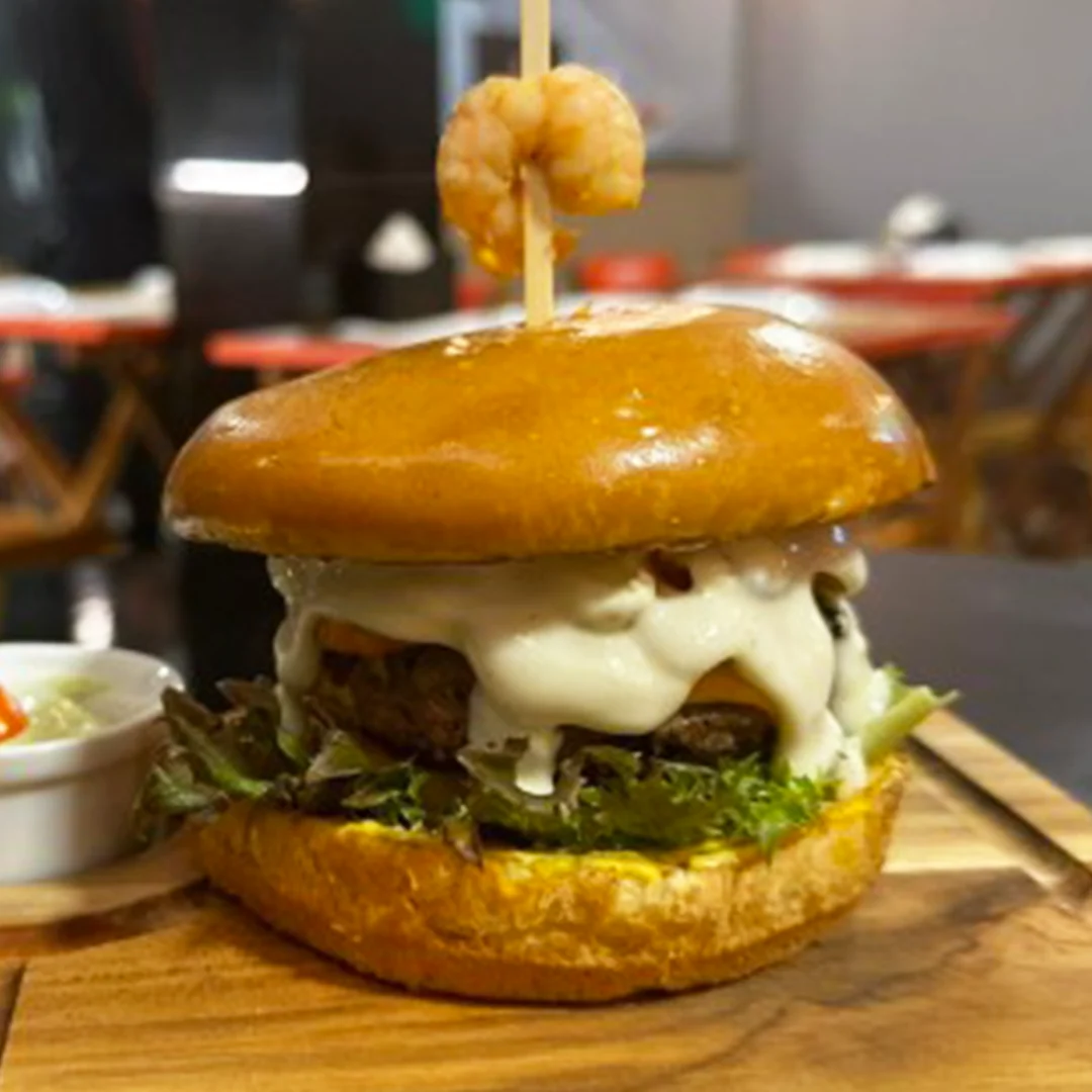 Pão especial, blende 150gr, mussarela, camarão grelhado ao molho de crem cheese, molho especial, alface e tomate.