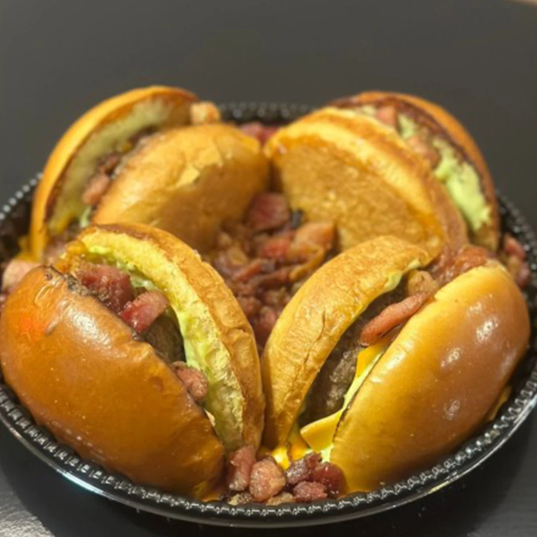 Pão especial, 2 blendes de 150gr, 2 queijos cheddar, cebola caramelizada, maionese de bacon, alface e tomate.